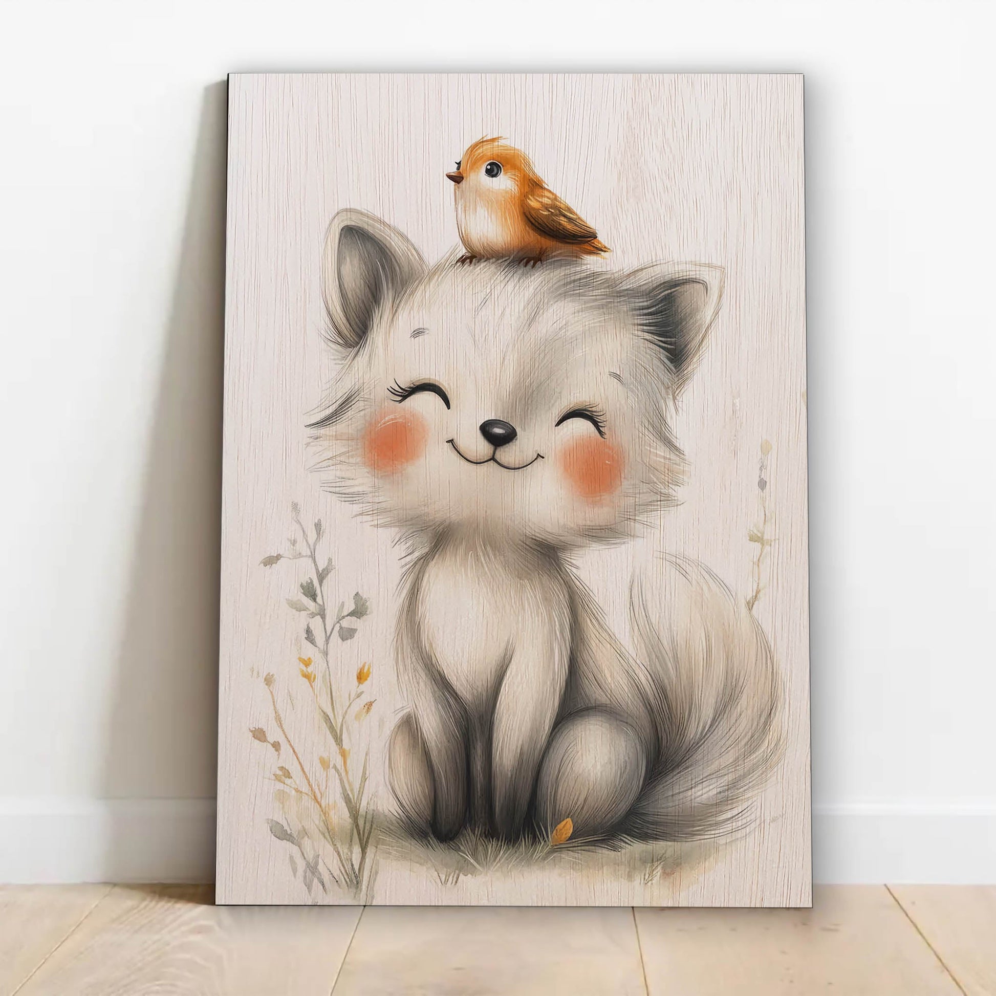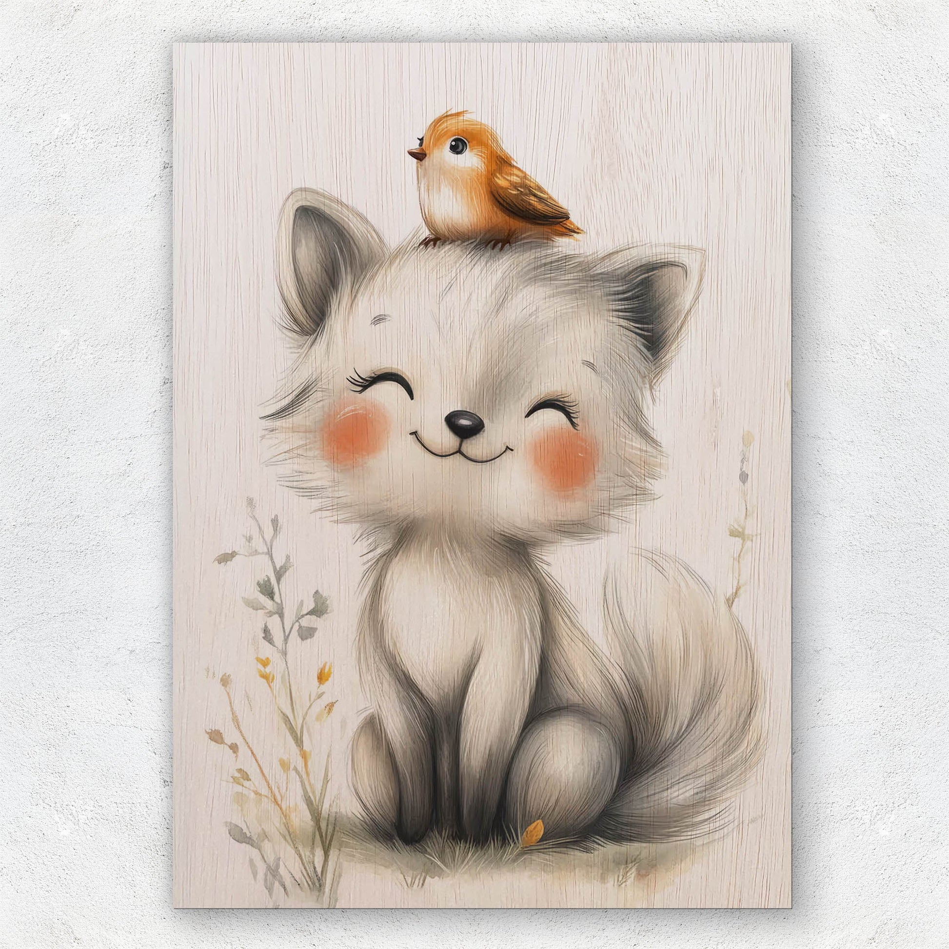 Cute Arctic Fox with Bird Laser Cut Wood Poster