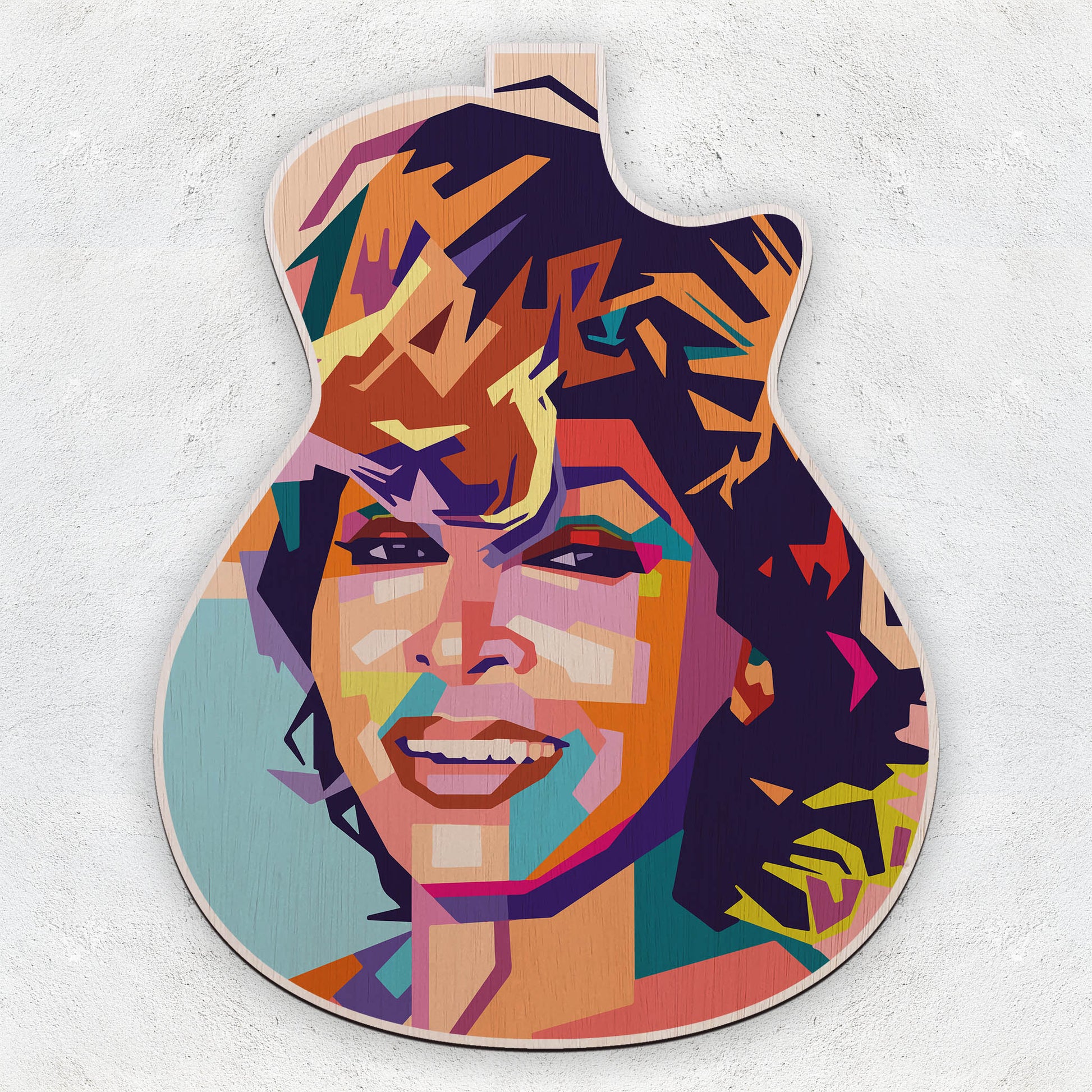 Printed directly onto 1cm thick, premium Australian-made Laserply, this 40cm × 32cm guitar-shaped wood print fuses vibrant digital artwork with the natural warmth and texture of wood.